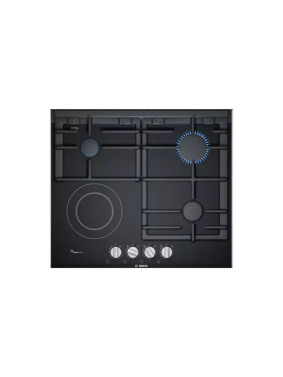 Варочная панель Bosch PRY6A6B70Q оснащена системой FlameSelect с помощью, которой можно регулировать пламя с девятью определенными уровнями мощности. Панель оснащена чугунными решетками, а управление осуществляется с помощью удобных поворотных регуляторов. Имеется электрическая конфорка повышенной мощности, так же поверхность изготовлена из стеклокерамики.