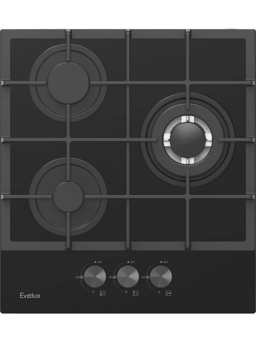 Газовая варочная панель Evelux HEG 425 BG Hi-Tech, 45 см, 3 конфорки, WOK-конфорка, чугунные решетки, газ-контроль, электроподжиг, механическое управление, черный