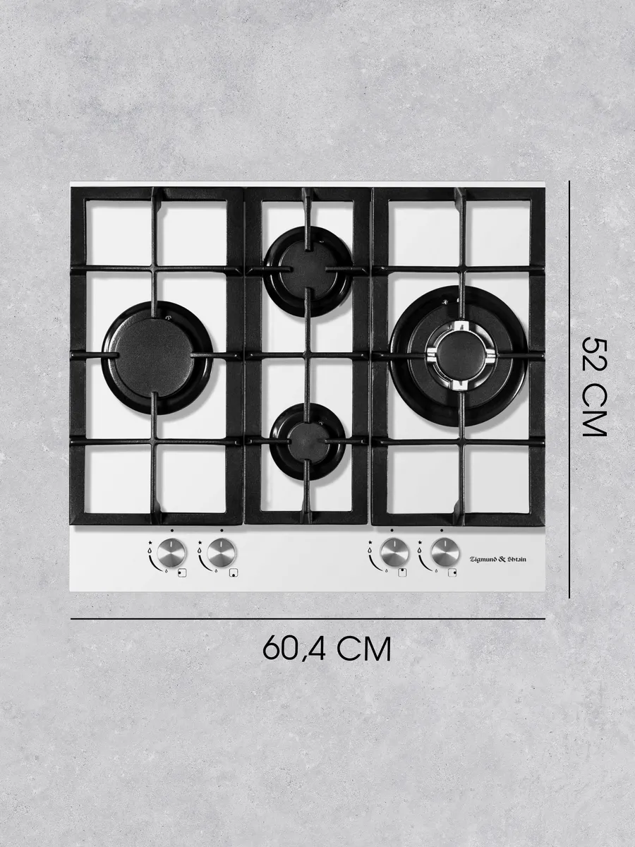 Газовая варочная поверхность Zigmund & Shtain MN 114.61 W обладает панелью белого цвета из высокопрочного закаленного стекла и чугунными черными решетками, надежно удерживающими посуду разного размера. Для быстрого приготовления предусмотрены конфорки с тройным и двойным рядом пламени. Всего предлагается 4 конфорки разной мощности для одновременного приготовления нескольких блюд одновременно. Для управления интенсивностью нагрева установлены поворотные переключатели. Технология электроподжига облегчает активацию конфорок без использования средств розжига, а система газ-контроля исключает вероятность утечки топлива в случае затухания пламени для безопасности в эксплуатации Zigmund & Shtain MN 114.61 W.