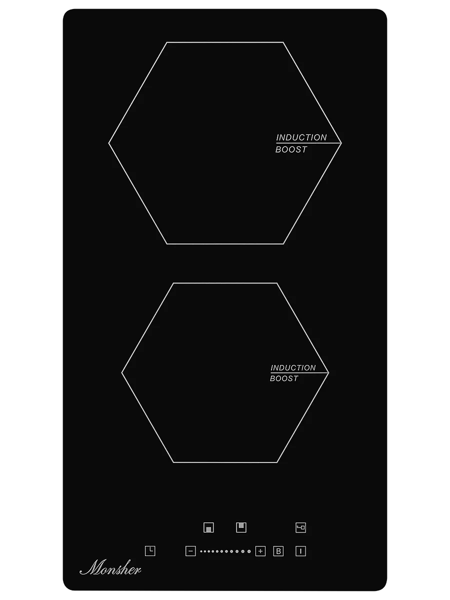 Индукционная варочная панель домино Monsher MHI 3002, Стеклокерамика KANGER, ширина 30 см, 2 индукционные зоны нагрева: 1 зона 1,2 кВт/Booster 1.5 кВт, 2 зона 2 кВт/Booster 2.3 кВт, электронное сенсорное управление, 3 цифровых дисплея, 9-ступенчатая настройка мощности, автоматическое отключение, дисплей, таймер, блокировка панели управления, индикаторы остаточного тепла, : черный