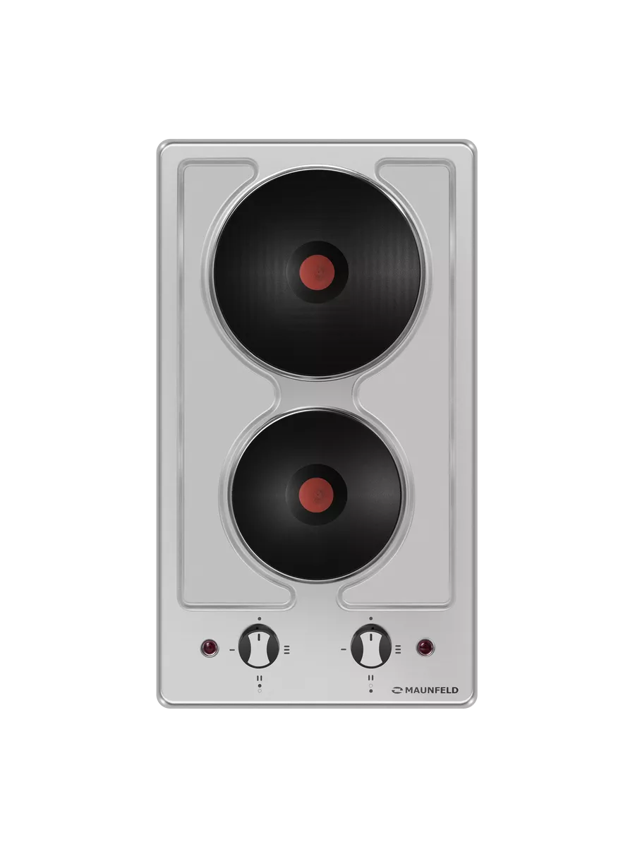 Электрическая варочная панель MAUNFELD EEHS.32.4S — эффективный и надежный помощник на вашей кухне! Компактная встраиваемая варочная панель шириной 30 см, выполненная из нержавеющей стали с термостойким покрытием эмали. Она не только встраивается в столешницу, но и может использоваться как отдельностоящая плита. Для этого предусмотрены 4 прорезиненные ножки-опоры. Варочная поверхность имеет бортик по всему периметру плиты и вокруг каждой конфорки. Благодаря этому, выкипевшая жидкость не попадает ни на горячую конфорку, ни на столешницу. Оборудована 2-мя прочными чугунными конфорками быстрого нагрева HP RAPID со стальной окантовкой: одна конфорка мощностью 1500 Вт (d150 мм) вторая мощностью 1500 Вт (d185 мм). Регулирование работы конфорок осуществляется с помощью поворотных переключателей, выполненных из высокопрочного термостойкого пластика белого цвета с элегантными стальными вставками. Около каждой ручки есть индикатор работы конфорки.